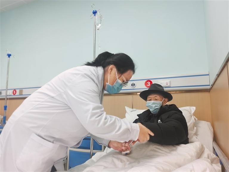 圖為護(hù)士白瑪曲珍檢查次仁旺堆老人輸液情況。記者 孫開遠(yuǎn) 攝