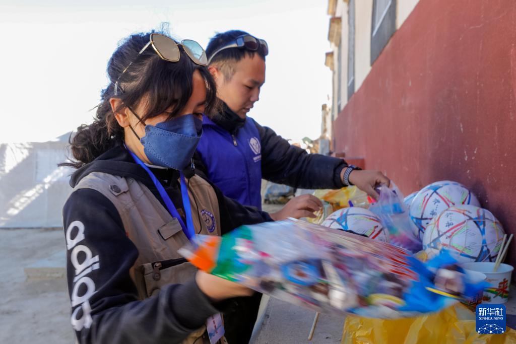 1月11日,在定日縣曲洛鄉(xiāng)措昂村的受災(zāi)群眾安置點(diǎn),譚惜仁(左)與志愿者一起整理捐給孩子們的足球、畫筆、食品等物資。新華社記者 沈伯韓 攝 ??
