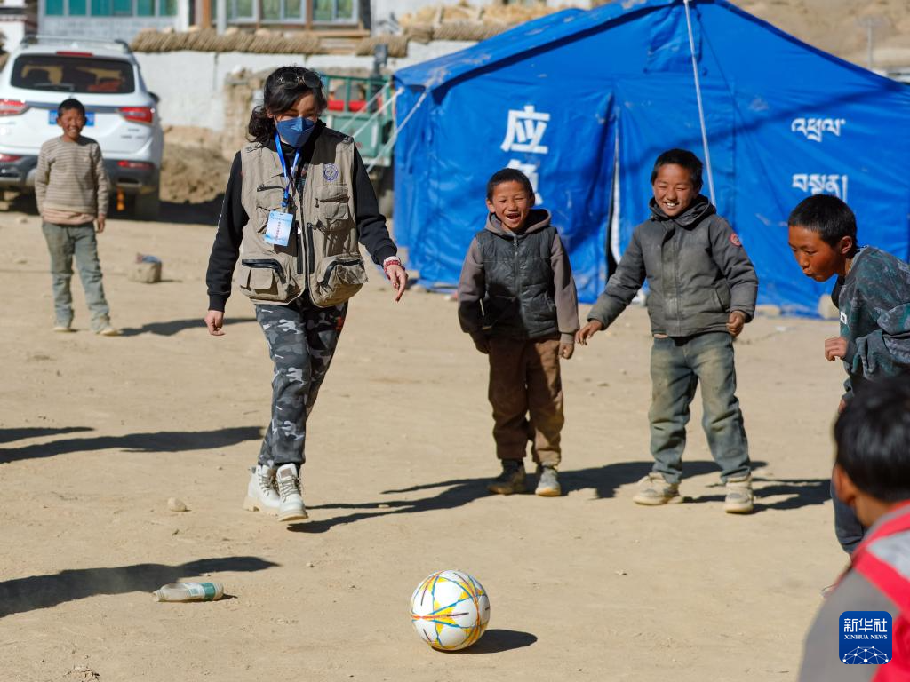 1月11日,在定日縣曲洛鄉(xiāng)措昂村的受災(zāi)群眾安置點(diǎn),譚惜仁與孩子們一起踢足球。新華社記者 沈伯韓 攝 ??
