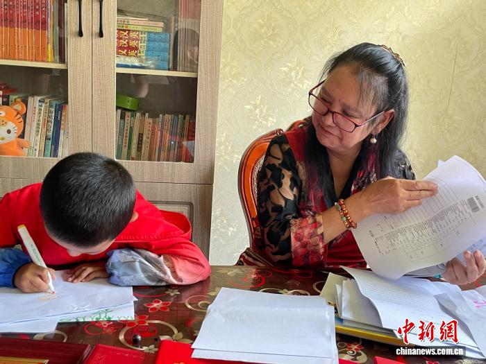 圖為格桑卓瑪看著孩子畫畫。趙朗 攝