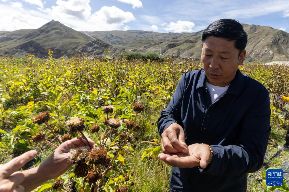 在西藏山南德諾農(nóng)林產(chǎn)業(yè)開發(fā)有限責任公司的種植基地,公司總經(jīng)理普巴在查看藏藥材草紅花的長勢(9月18日攝)。新華社記者 姜帆 攝