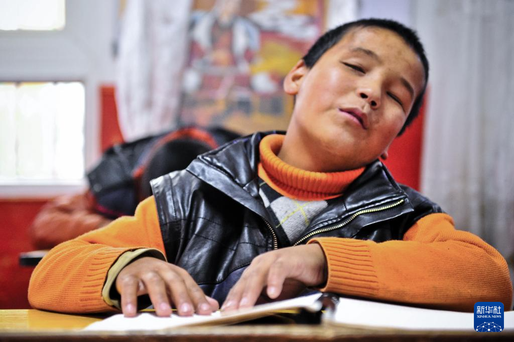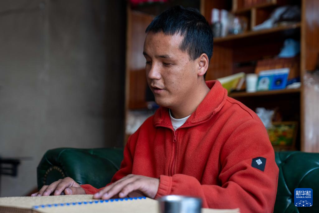 2025年10月10日,達(dá)瓦次仁在“閱讀”盲文書(shū)籍。