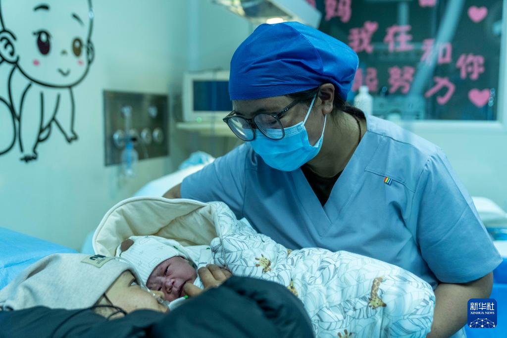 2026年1月1日,西藏自治區(qū)人民醫(yī)院婦產(chǎn)科助產(chǎn)醫(yī)生次拉(右)讓孩子母親旦增曲珍撫摸新生兒。新華社記者 旦增尼瑪曲珠 攝