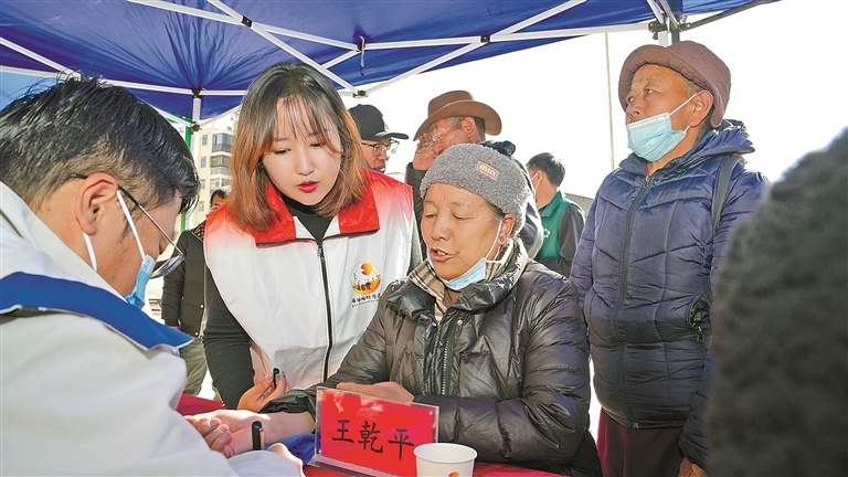 為進(jìn)一步深化社區(qū)養(yǎng)老服務(wù)體系建設(shè),切實回應(yīng)老年人的健康關(guān)切,近年來,城關(guān)區(qū)奪底街道桑伊社區(qū)聚焦重點服務(wù)群體,創(chuàng)新探索“黨建引領(lǐng)+志愿服務(wù)+專業(yè)醫(yī)養(yǎng)”三位一體助老服務(wù)新模式,取得良好成效。圖為三沐醫(yī)養(yǎng)專業(yè)人員與桑伊社區(qū)“布谷響鈴”志愿者協(xié)同配合,為轄區(qū)老年人免費(fèi)開展健康指標(biāo)監(jiān)測。記者 鹿麗娟 攝