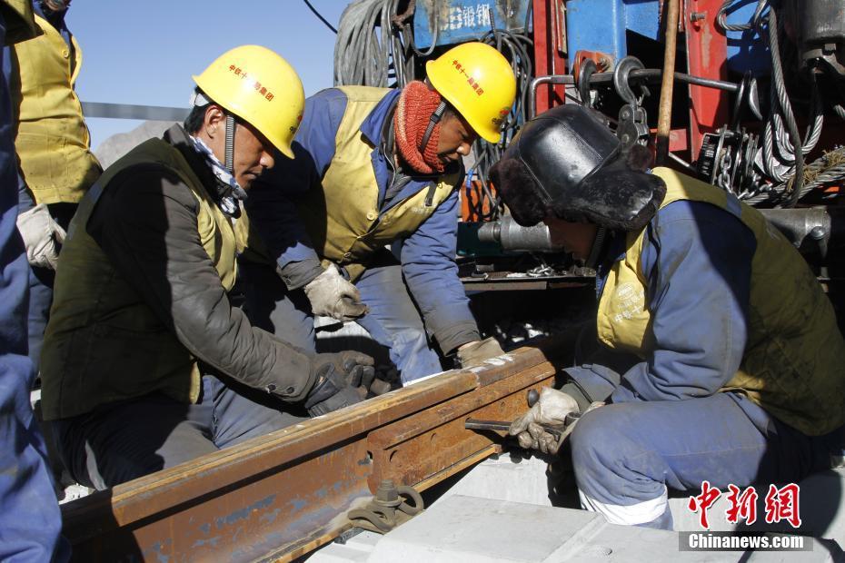 11月26日,中鐵十一局三公司拉林鐵路項目部鋪架二隊工人鋪設拉林鐵路首跨貢嘎雅魯藏布江特大橋鐵軌。拉林鐵路共計上跨雅魯藏布江16處,貢嘎雅魯藏布江特大橋全長5727米,為拉林鐵路全線最長橋梁。拉林鐵路起于西藏自治區(qū)首府拉薩,終點為林芝市,拉林鐵路新建正線鋪軌403.14千米,運營長度435.48千米。中新社記者 趙朗 攝