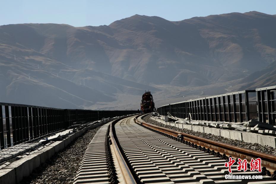 11月26日,中鐵十一局三公司拉林鐵路項目部鋪架二隊工人鋪設拉林鐵路首跨貢嘎雅魯藏布江特大橋鐵軌。拉林鐵路共計上跨雅魯藏布江16處,貢嘎雅魯藏布江特大橋全長5727米,為拉林鐵路全線最長橋梁。拉林鐵路起于西藏自治區(qū)首府拉薩,終點為林芝市,拉林鐵路新建正線鋪軌403.14千米,運營長度435.48千米。圖為部分鐵路已經(jīng)鋪設完成。中新社記者 趙朗 攝