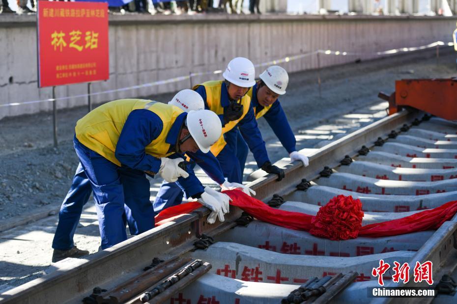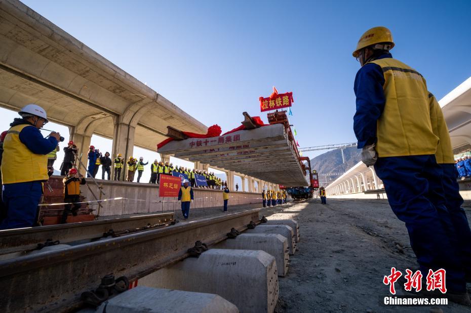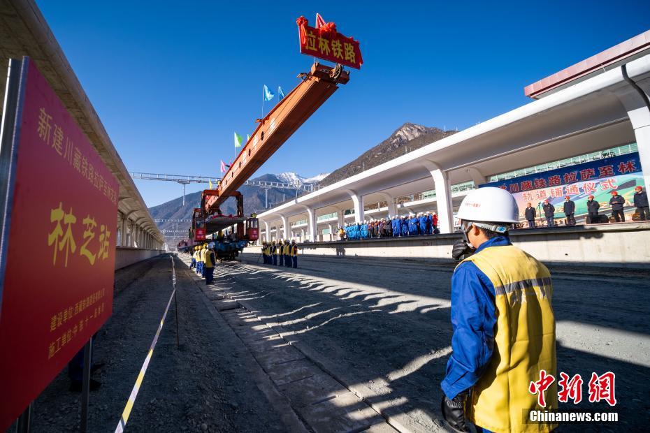 12月31日,拉林鐵路最后一段軌排鋪設現(xiàn)場。當日,在西藏林芝市尼洋河畔的新建林芝火車站,川藏鐵路拉薩至林芝段(拉林鐵路)最后一段軌排順利鋪設,這標志著拉林鐵路399.61公里的正線軌道全部鋪通,西藏東南地區(qū)結束無鐵路歷史。拉林鐵路起自西藏自治區(qū)首府拉薩,終點為林芝市,正線全長435.5公里,新建正線403.1公里,系西藏首條電氣化鐵路,設計行車速度為160km/h,全線計劃于2021年6月30日建成通車。中新社記者 何蓬磊 攝