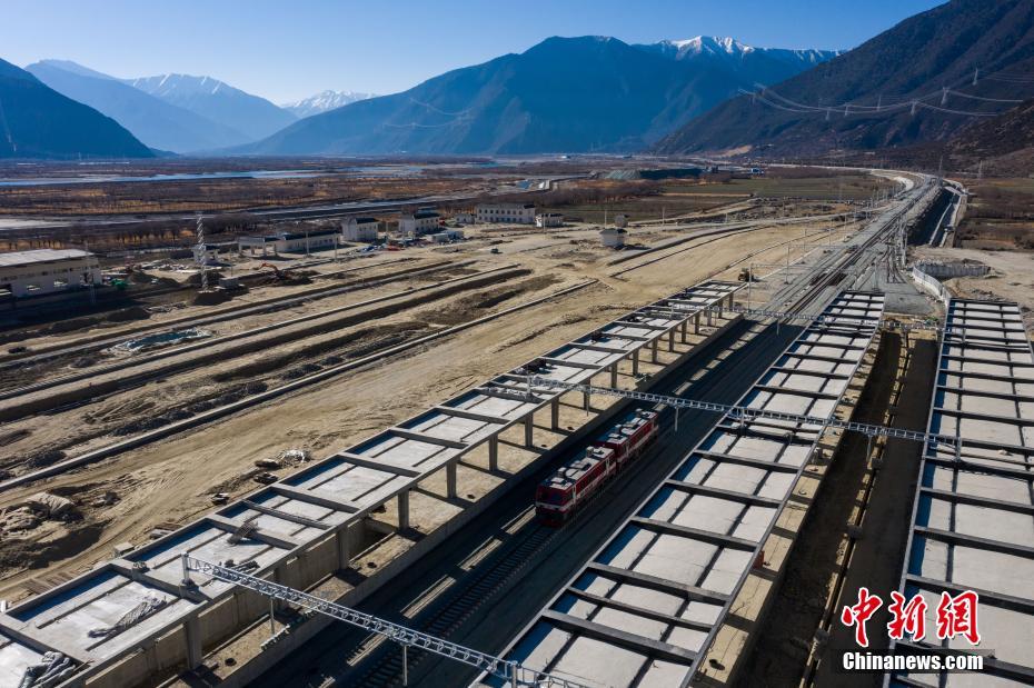 12月31日,中鐵十一局軌道車通過鋪設完成的拉林鐵路林芝站。當日,在西藏林芝市尼洋河畔的新建林芝火車站,川藏鐵路拉薩至林芝段(拉林鐵路)最后一段軌排順利鋪設,這標志著拉林鐵路399.61公里的正線軌道全部鋪通,西藏東南地區(qū)結束無鐵路歷史。拉林鐵路起自西藏自治區(qū)首府拉薩,終點為林芝市,正線全長435.5公里,新建正線403.1公里,系西藏首條電氣化鐵路,設計行車速度為160km/h,全線計劃于2021年6月30日建成通車。(無人機照片)中新社記者 何蓬磊 攝