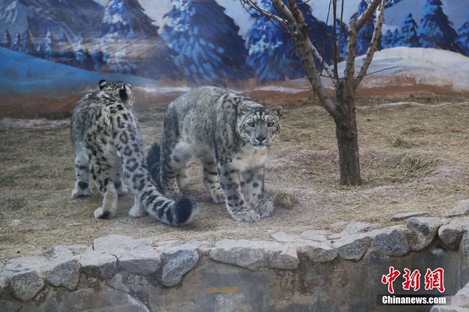 3月13日,青藏高原野生動(dòng)物園雪豹館內(nèi),“傲雪”(左)陪伴21歲的“大豹”(右)散步。中新社記者 馬銘言 攝