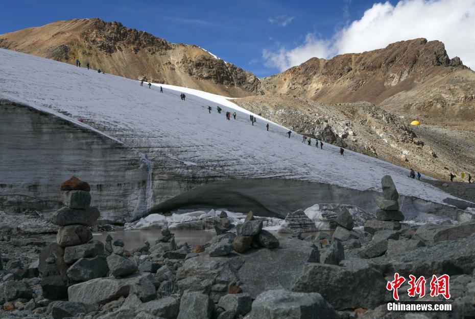 西藏拉薩河谷1號(hào)冰川(廓瓊崗日冰川)景區(qū)將與2021年4月正式全面開(kāi)放,洛堆峰雪山攀登項(xiàng)目也將正式啟動(dòng)。資料圖為游客在洛堆峰游玩。(無(wú)人機(jī)拍攝)中新社發(fā) 貢嘎來(lái)松 攝