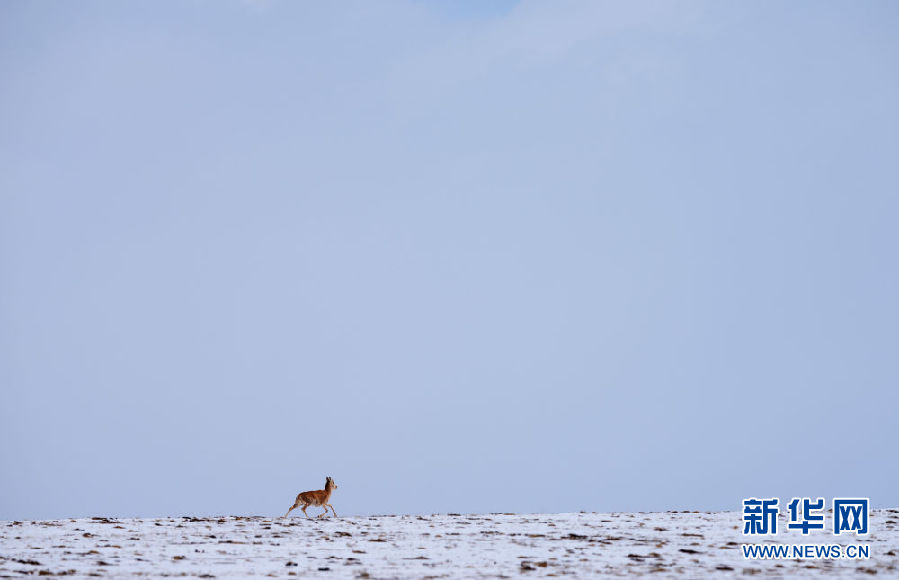 4月20日,一只藏羚羊向卓乃湖方向行進(jìn)。新華社記者 吳剛 攝