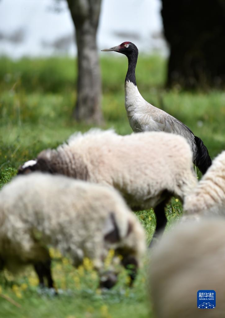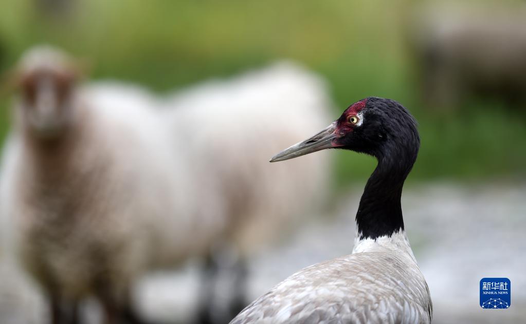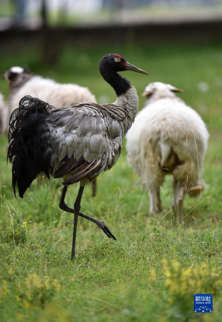 9月8日,黑頸鶴站在羊群中。新華社記者 覺果 攝