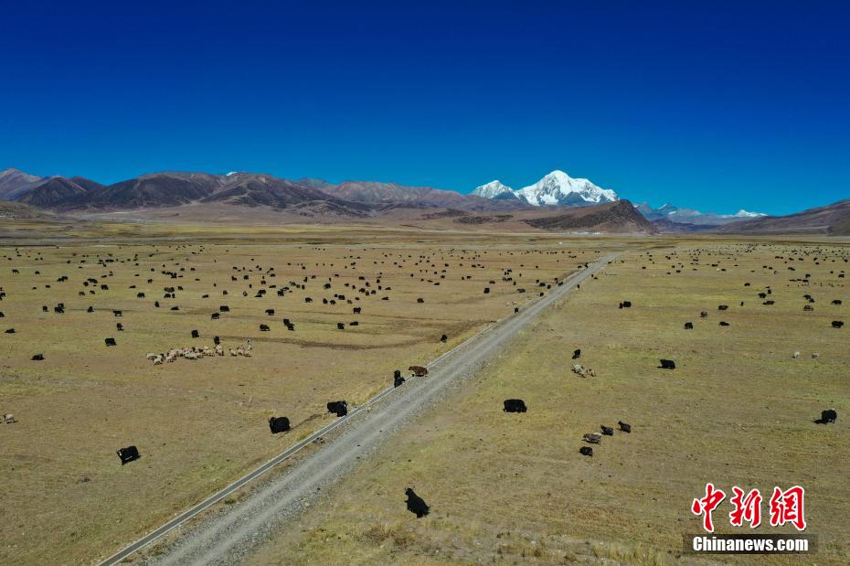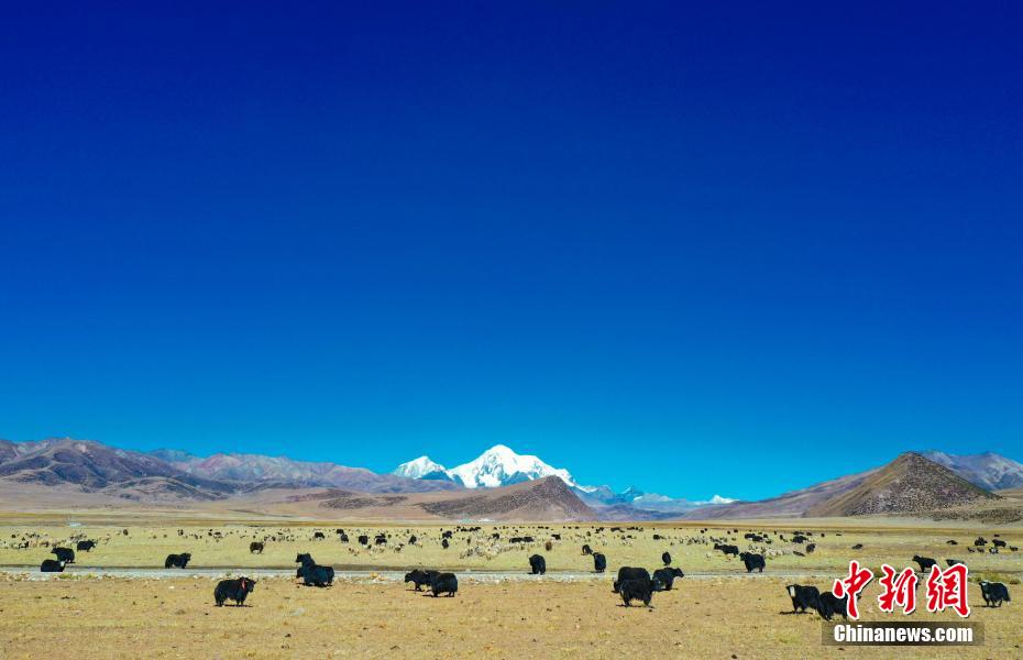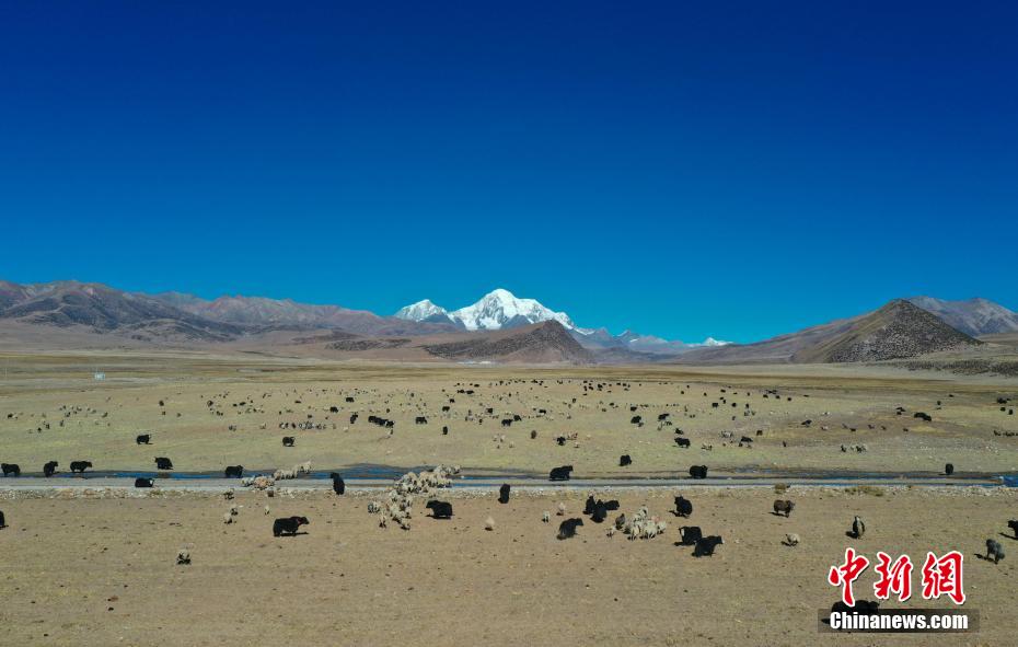 圖為瓊穆崗嘎雪山腳下成群結(jié)隊(duì)的牛羊。(無人機(jī)照片) 貢嘎來松 攝
