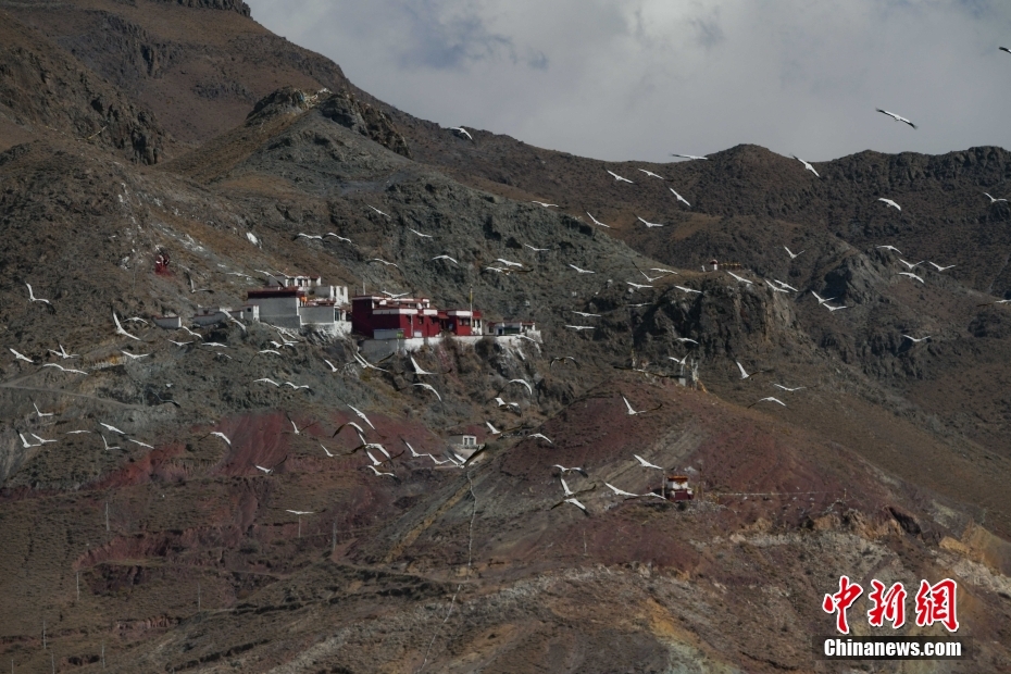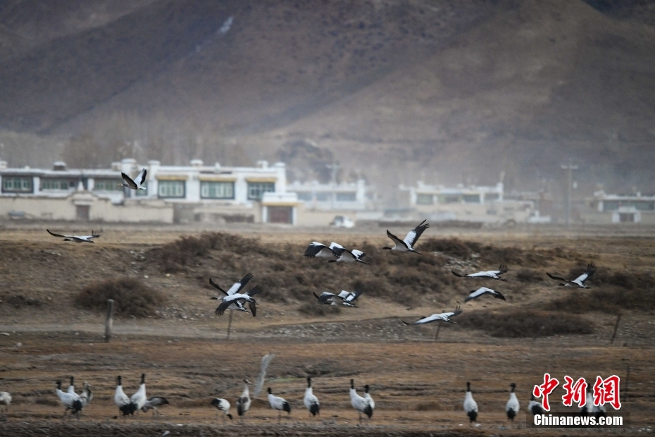 11月23日,在西藏自治區(qū)拉薩市林周縣境內(nèi),飛翔的黑頸鶴群。由于適宜的環(huán)境和充足的食物,冬季的拉薩市林周縣成了越來越多黑頸鶴聚集的家園。中新社記者 貢嘎來松 攝