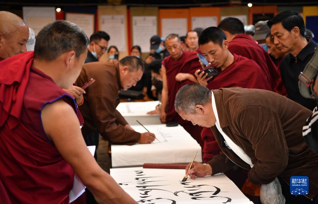 4月28日,拉薩大昭寺僧人與書法家切磋技藝。新華社記者 覺(jué)果 攝