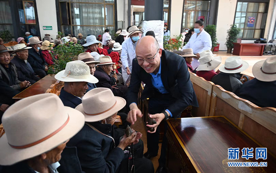 6月3日,在西藏山南市集中供養(yǎng)服務中心,安徽第七批援藏工作隊隊長汪華東為孤寡老人送上粽子。新華網(wǎng) 王雷 攝