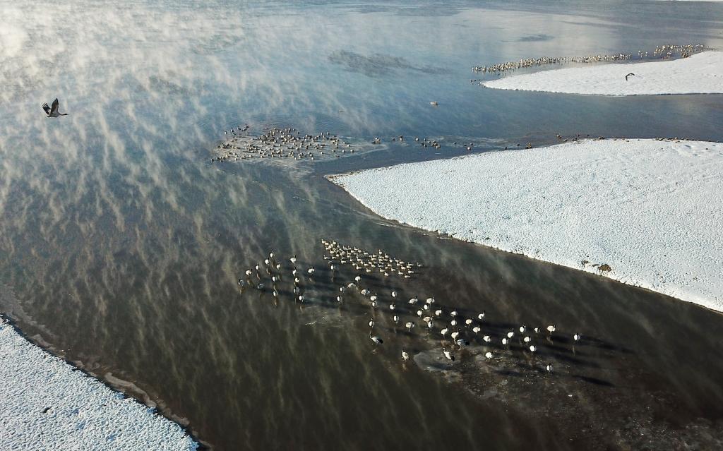 這是在拉薩市林周縣虎頭山水庫拍攝到的黑頸鶴(2月22日攝,無人機(jī)照片)。新華社記者 姜帆 攝