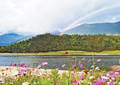 夏日的魯朗鎮(zhèn),溪水潺潺,鮮花盛開,藏式村寨點(diǎn)綴其間,勾畫出一幅恬靜、優(yōu)美的“高原山居圖”。
