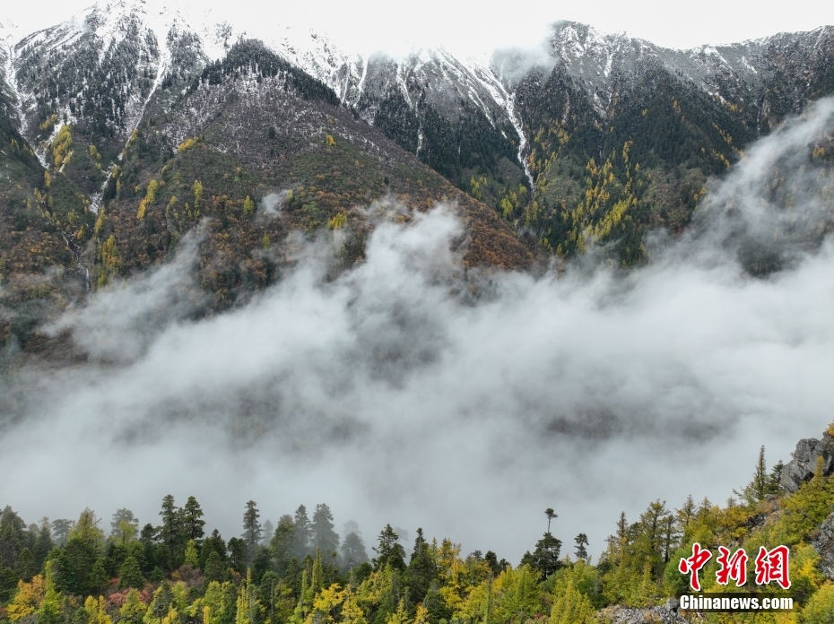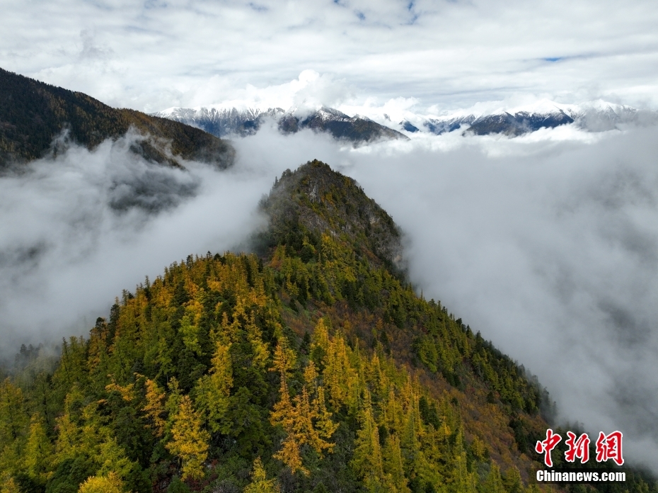 10月26日,航拍西藏多雄拉雪山,雪山與層林盡染的森林組成一幅壯美的秋日高原畫卷。西藏林芝多雄拉雪山位于喜馬拉雅山脈北段主脊,曾是徒步進入墨脫縣最艱險的路段之一。(無人機照片) 中新社發(fā) 董志雄 攝