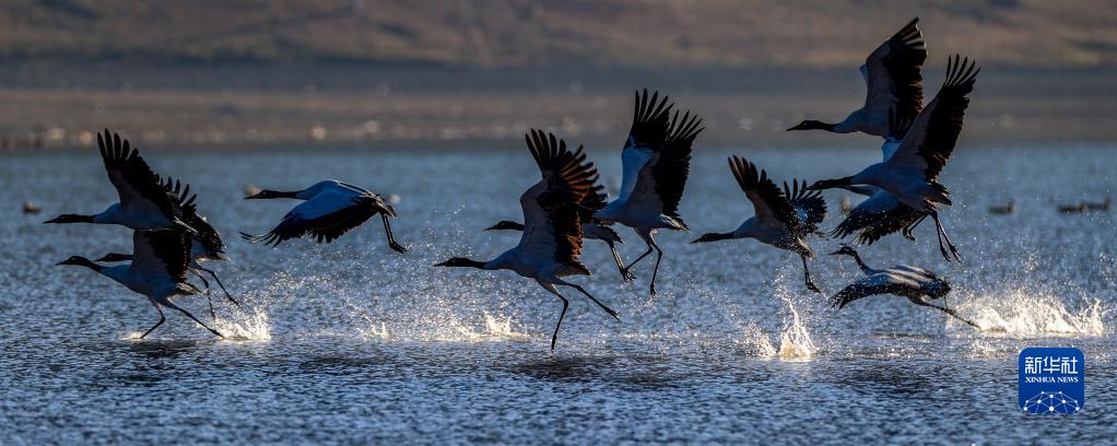 黑頸鶴在林周縣虎頭山水庫(kù)上空飛翔(11月6日攝)。新華社記者 呂秋平 攝