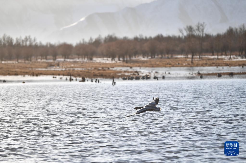在拉薩市林周縣唐嘎鄉(xiāng),斑頭雁在拉薩河上空飛翔(3月1日攝)。新華社記者 晉美多吉 攝