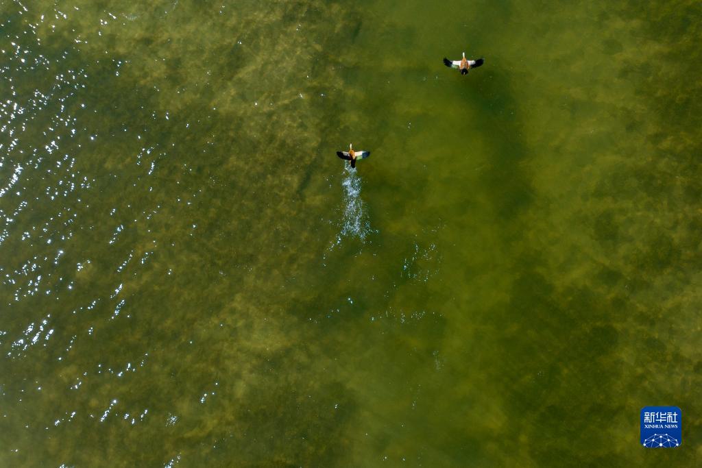 飛鳥(niǎo)從打加錯(cuò)湖面掠過(guò)(無(wú)人機(jī)照片,8月30日攝)。新華社發(fā)(旦增努布 攝)