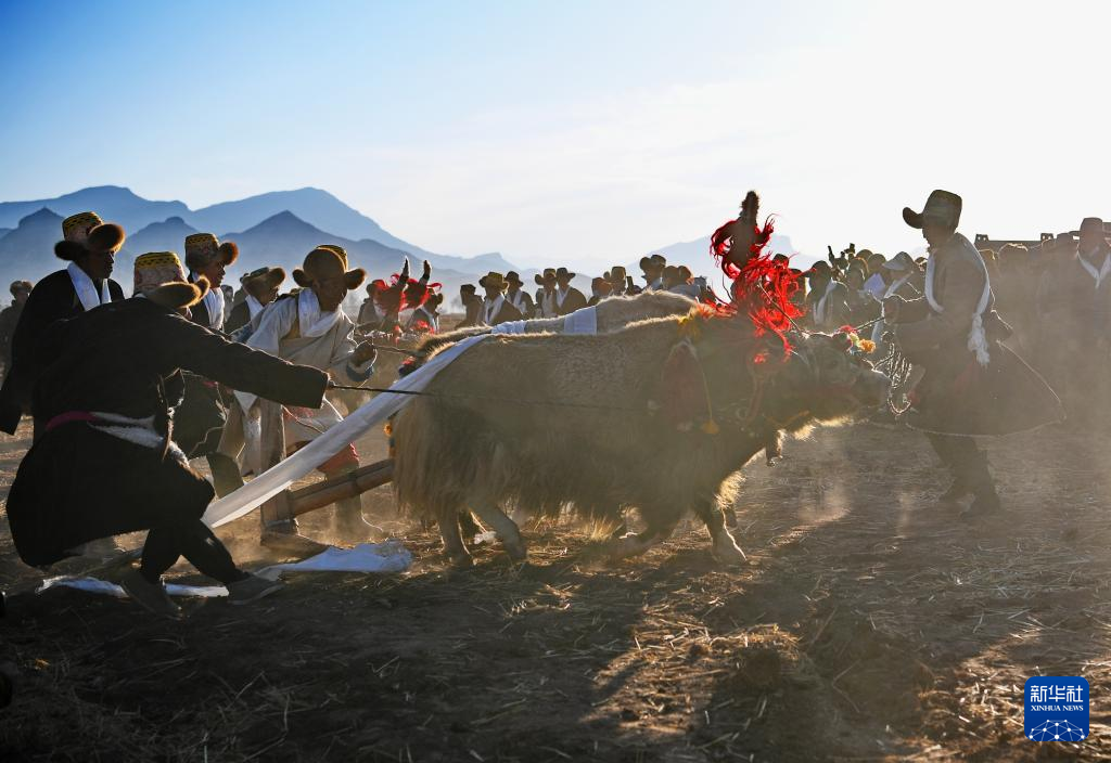 3月16日,在西藏拉薩市林周縣春堆鄉(xiāng)的春耕儀式現(xiàn)場,當(dāng)?shù)厝罕姳硌莶貞颉P氯A社記者 張汝鋒 攝