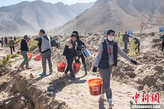 圖為西藏拉薩曲水縣才納鄉(xiāng)四季吉祥村義務(wù)植樹點(diǎn)志愿者們忙著提水 何蓬磊 攝