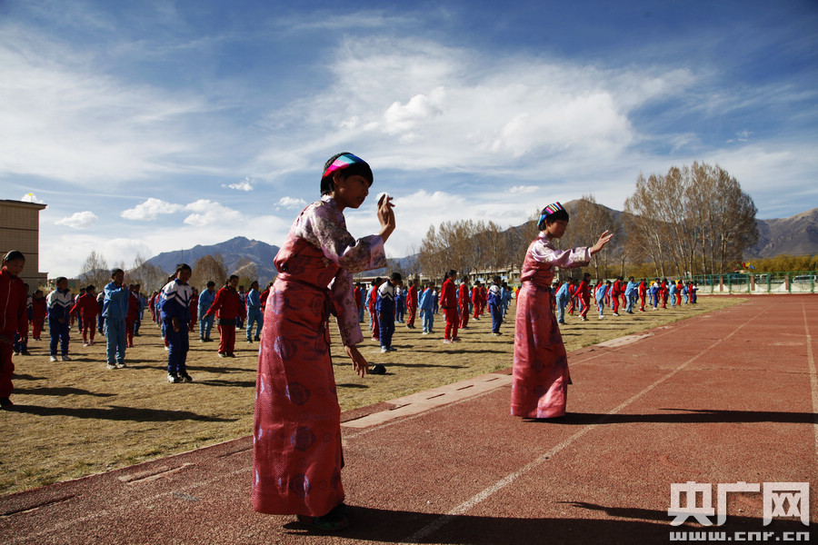 山南素有“果諧之鄉(xiāng)”的美稱,該市扎囊縣的“扎囊果諧”曲調(diào)獨具特色,激情熱烈,具有很強的感染力,2006年被列入西藏自治區(qū)非物質(zhì)文化遺產(chǎn)名錄。為更好地傳承這一民間舞蹈,扎囊縣從2013年開始在校園推廣這種新式課間操。圖為兩名藏族女孩帶領(lǐng)數(shù)百名扎囊縣中學學生跳起“果諧舞”課間操。圖片來源:央廣網(wǎng)
