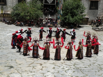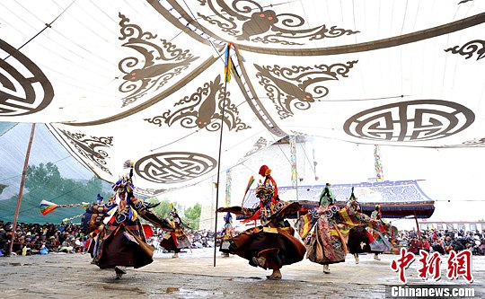 由于藏傳佛教的影響,很多藏文化帶有宗教色彩。在藏族舞蹈中,“羌姆”(俗稱 “跳神”)屬于最為重要的宗教類別寺院祭祀性舞蹈。每逢重大宗教節(jié)日,西藏僧侶們便穿起彩袍,戴上面具,佩彩帶和刀盾,伴著牛角號、嗩吶等樂器跳起威武莊嚴的“羌姆”。圖為山南地區(qū)桑耶寺僧人 “羌姆”表演。圖片來源:中新網(wǎng)