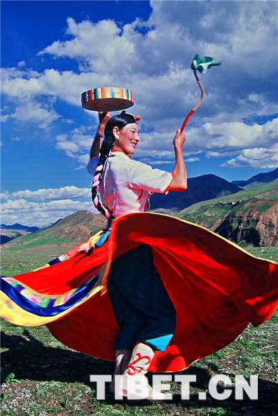 藏舞千姿百態(tài),種類繁多,有不同分類方式。一種說法將藏族舞蹈分為 “民間歌舞”(果諧、堆諧、果卓等),“宗教舞蹈”(“羌姆”、祭祀舞等),戲曲舞(格薩爾等)和宮廷舞(“嘎爾”舞、古格宣舞等)四類。圖為牧民的女兒熱情舞蹈。圖片來源:中國西藏網(wǎng),孫明光攝。