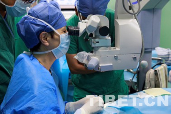 圖為愛心醫(yī)療隊醫(yī)務(wù)人員為實(shí)施白內(nèi)障手術(shù)的患者固定紗布。攝影:扎西