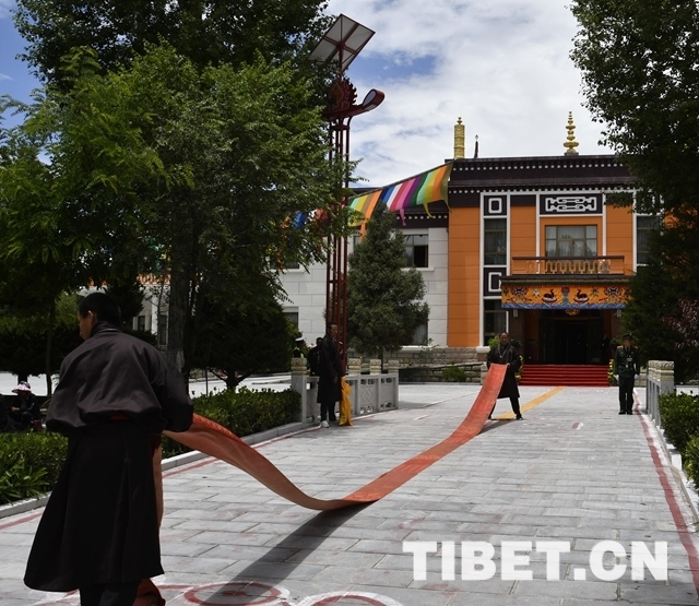 在位于拉薩市區(qū)的班禪行宮雪林多吉頗章主殿前,僧人們提前繪制了金剛結(jié)等吉祥圖案,一條尺許寬的地毯從歡迎隊伍處一直延伸到主殿門前。