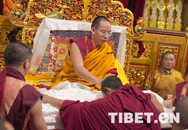 下午,十一世班禪登上拉讓日光殿寶座,接受扎什倫布寺管委會僧人成員、高僧的朝拜,為他們摸頂賜福,并帶領(lǐng)高僧集體誦經(jīng)祈禱。