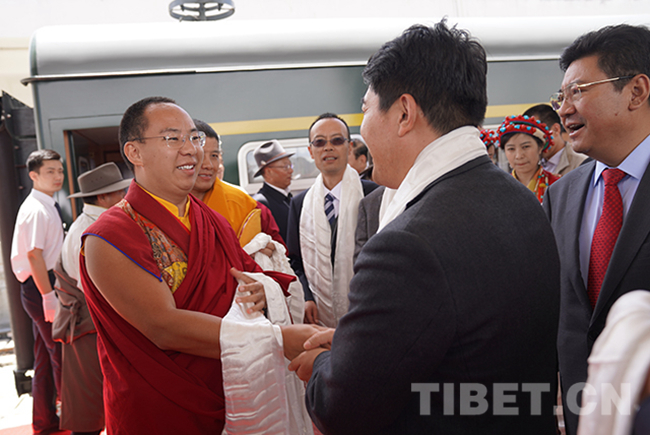日喀則市有關(guān)領(lǐng)導在火車站迎接十一世班禪。攝影:王淑