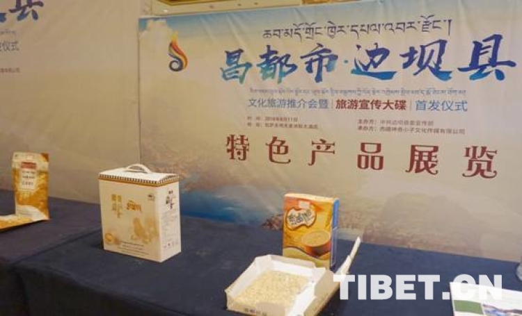 昌都邊壩旅游文化宣傳電視音樂專輯《醉美三色湖?吉祥邊壩》首發(fā)儀式暨文化旅游推介會(huì)現(xiàn)場展示的當(dāng)?shù)靥厣a(chǎn)品。攝影:扎西