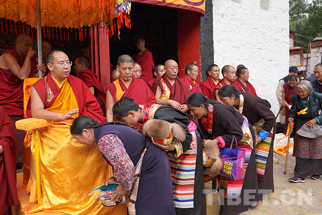 考察結(jié)束后,十一世班禪不顧路途勞頓,稍事歇息便前往達(dá)布夏珠林寺朝拜并為當(dāng)?shù)厣仔疟娕e行長(zhǎng)壽灌頂。由手持香爐和吹嗩吶的僧人引領(lǐng),在手持黃傘的僧人護(hù)送下,十一世班禪步入達(dá)布夏珠林寺杜康殿朝拜。朝拜后,他登上法臺(tái),領(lǐng)誦經(jīng)文并微笑接過寺廟僧人虔誠捧上的曼扎等供奉,為他們摸頂賜福、發(fā)放布施。