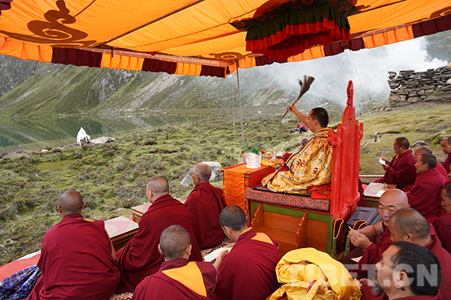 8月18日,藏歷和農(nóng)歷的七月初八,是一個(gè)極為殊勝的日子,十一世班禪來到拉姆拉錯(cuò)祭湖、朝拜。拉姆拉錯(cuò)在藏語中的意思是“天女之魂湖”,在藏傳佛教轉(zhuǎn)世中,有著特殊地位。每次尋訪達(dá)賴?yán)?、班禪額爾德尼等大活佛的轉(zhuǎn)世靈童前,都要到此湖觀湖卜相,以受神示。據(jù)說,朝拜此湖的有緣之人只要虔誠地向湖中凝望,圣湖中就能為朝圣者顯示出未來的各種景象,因而備受信徒敬仰。在拉姆拉錯(cuò)湖邊,十一世班禪登上法座,依照宗教儀軌誦經(jīng)祈福,祈禱世界和平,國泰民安,風(fēng)調(diào)雨順,眾生幸福。祭祀祈福的經(jīng)文念誦結(jié)束后,兩位僧人拿著裝藏好的寶瓶,從祭臺(tái)走到湖岸。在湖岸等候的僧人們?cè)缫褱?zhǔn)備好絲繩,待寶瓶送至,便將絲繩穿引在寶瓶上,由湖對(duì)岸的僧人們牽引,寶瓶緩緩沒入水中。