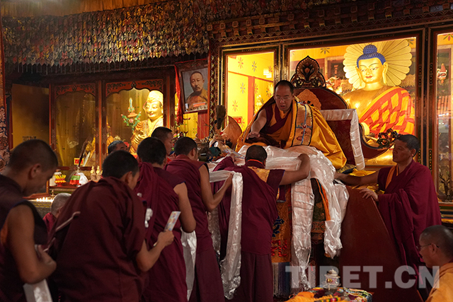 十一世班禪頭戴金色佛冠,由手持香炷的僧人引領(lǐng),緩緩步入杜康大殿。在僧人們渾厚的誦經(jīng)聲中,十一世班禪登上法座,領(lǐng)誦經(jīng)文。寺廟僧人向十一世班禪敬獻(xiàn)曼扎等,十一世班禪微笑接過(guò)后,為僧人摸頂賜福,并發(fā)放布施、供齋茶齋飯。隨后,十一世班禪朝拜珍珠唐卡殿。