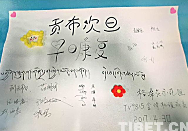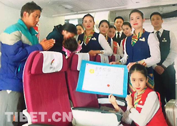 圖為2017年4月30日,TV9815從拉薩到北京執(zhí)飛途中,格?;ò嘟M護(hù)送因燒傷急需赴京救治的1歲零7個月的貢布次旦一家,并為其募款。藏航供圖