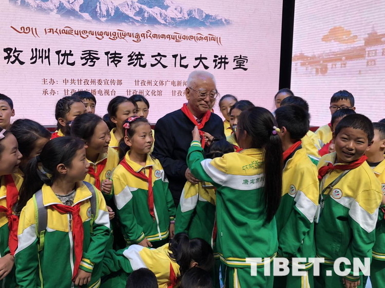 圖為現(xiàn)場小聽眾為主講人降邊嘉措系上紅領(lǐng)巾。圖片由甘孜電視臺提供