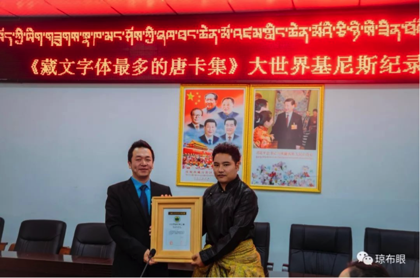 瓊布丁青是瓊文化的發(fā)祥地,同時(shí)也是藏文書法大家瓊布玉赤的誕生地,有“中國藏文書法之廩”的美譽(yù)。在這樣的文化環(huán)境熏陶下,出現(xiàn)了許許多多做文化事、行文化路的人民宣傳員,他們用最實(shí)際的行動(dòng)表達(dá)著對(duì)非遺瓊布書法的熱愛?!氨敬文塬@得《藏文字體最多的唐卡集》大世界基尼斯紀(jì)錄是丁青人民文化宣傳員嘔心瀝血?dú)v經(jīng)兩年收集、制作所得到的回報(bào),是堅(jiān)定文化自信、堅(jiān)持文化強(qiáng)國在中華大地的又一次偉大實(shí)踐?!倍∏嗫h文物局相關(guān)負(fù)責(zé)人希望,通過申請(qǐng)大世界基尼斯之最,把弘揚(yáng)優(yōu)秀傳統(tǒng)文化和發(fā)展現(xiàn)實(shí)文化有機(jī)結(jié)合在一起,活態(tài)呈現(xiàn)活力繼承,以瓊文化為品牌,全面推進(jìn)社會(huì)主義文化強(qiáng)縣建設(shè),讓非物質(zhì)文化遺產(chǎn)活起來、用起來,譜寫丁青文化事業(yè)的新輝煌。