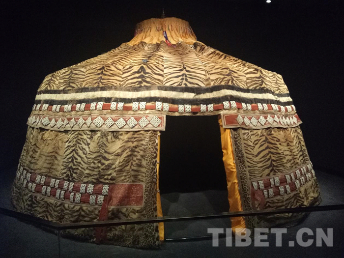 1638年,蒙古首領(lǐng)固始汗會見五世達(dá)賴?yán)?。?jù)理塘縣志及各類史料推測,此帳篷便是當(dāng)此前后,由固始汗贈與五世達(dá)賴?yán)锏摹!盎⑵づ裢w使用了100多張虎皮,上部黑色的兩圈為黑熊皮,黑熊皮夾著的白色部分為駱駝皮,帳篷門框兩邊使用的則是豹皮,四周又用1萬多顆海貝鑲串成吉祥圖案。這樣一頂帳篷造價(jià)不菲,考慮到當(dāng)時(shí)海貝在當(dāng)?shù)厥强梢粤魍ǖ呢泿牛攷づ窆夂X惥拖喈?dāng)于2億元人民幣?!辈┪镳^講解員介紹道。