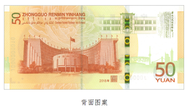 紀念鈔背面主景圖案為中國人民銀行大樓,輔以牡丹花、中國人民銀行舊址、第一套人民幣發(fā)行布告及城市建筑剪影圖案。票面左上角為面額數(shù)字“50”,中國人民銀行漢語拼音字母和蒙、藏、維、壯四種民族文字的“中國人民銀行”字樣與面額。票面下方為行長章與年號文字“2018年”。票面右下角為面額數(shù)字“50”,漢語拼音字母“YUAN”。