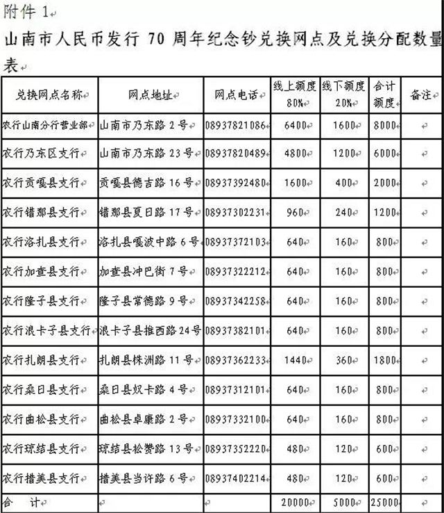 圖為山南市預約發(fā)行兌換網點及分配方案 圖片來源:中國人民銀行山南市中心支行