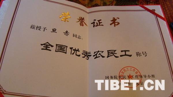 圖為旦赤獲得了“全國(guó)優(yōu)秀農(nóng)民工”稱號(hào)。
