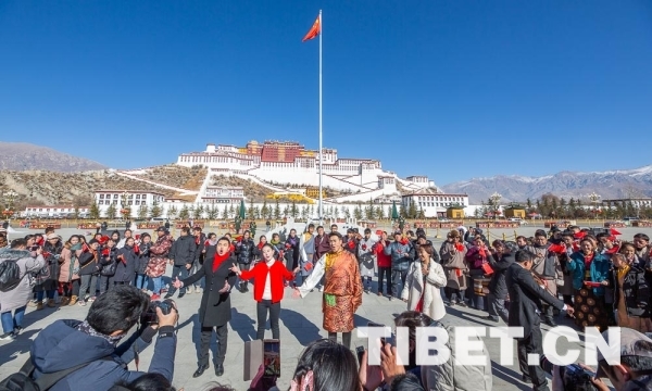中國西藏網(wǎng)訊 2018年12月31日,年終歲末,西藏自治區(qū)拉薩市布達拉宮廣場上演了《我和我的祖國》快閃活動。來自西藏的高校青年學生和市民群眾向祖國深情告白,用快閃的方式慶祝新中國成立70周年。