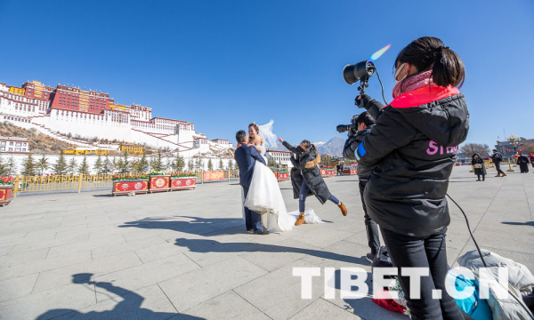 冬日的布達拉宮廣場上,身著盛裝的市民群眾三三兩兩的有說有笑;前來旅游的游客拉著行李箱漫步其中;不畏嚴寒拍攝婚紗照的新人露出甜蜜的笑容。