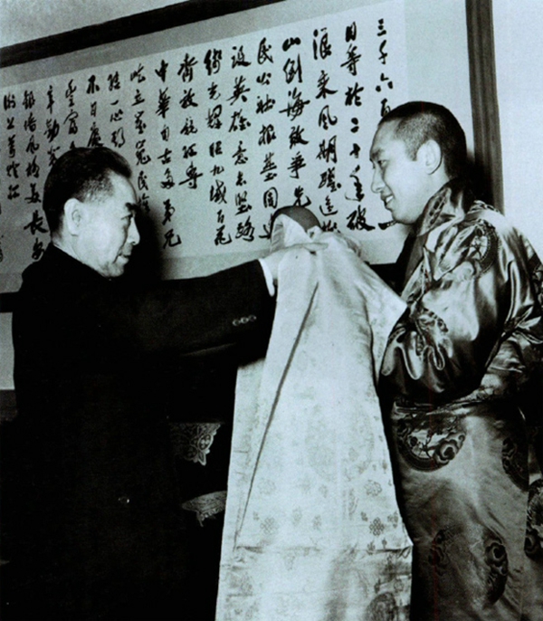 圖為十世班禪額爾德尼向周總理敬獻(xiàn)哈達(dá)。攝影:金持元