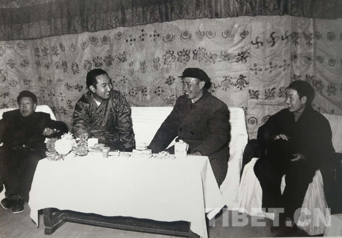 1960年2月16日,西藏自治區(qū)籌委會代理主任十世班禪(左二)、西藏自治區(qū)籌委會副主任帕巴拉?格列朗杰(右一)在北京參加建國十周年慶?;顒硬⒃趦?nèi)地參觀后回到拉薩。圖為張經(jīng)武(右二)與十世班禪等親切交談。